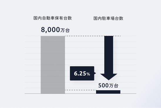 国内の⾃動⾞保有台数は約8,000万台以上に対し、国内の駐⾞場箇所は約500万台と慢性的に不⾜しています。さらにはカーシェアやレンタカーの利⽤台数の増加により、モビリティサービスは今後、安定した成⻑が⾒込める業界として認知されています。